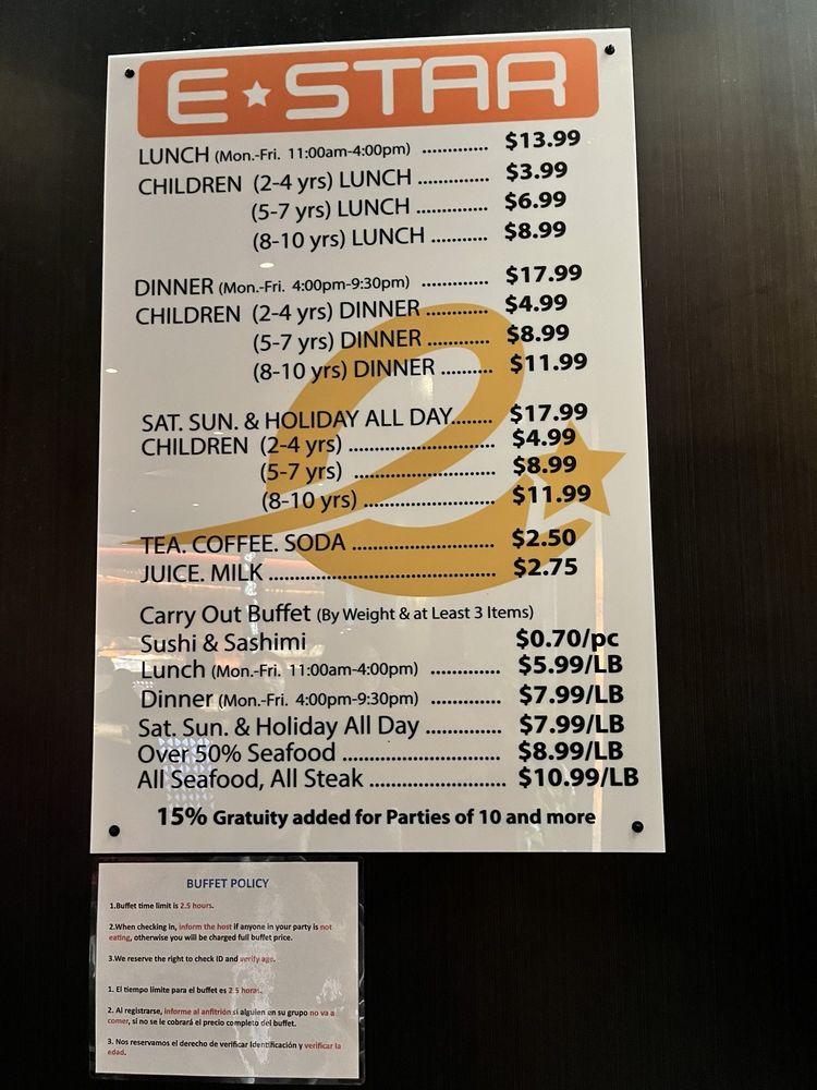 E-Star Asian Buffet offers a wide range of Asian cuisine, including seafood, sushi, and traditional Chinese dishes. Located in Houston, TX, this buffet-style restaurant provides a range of options for all tastes. Customers rave about the fresh and tasty seafood, sushi, and sashimi offerings, as well as the variety of Chinese dishes available. The atmosphere is cozy, with modern Asian-inspired decor. With friendly and attentive staff, E-Star Asian Buffet is known for its reasonable prices and discounts for seniors. The buffet is well-maintained and clean, offering a pleasant dining experience. Standout dishes include grilled short ribs, crispy calamari, and Korean BBQ steak. Overall, E-Star Asian Buffet is a must-visit for Asian cuisine lovers looking for a quality dining experience at an affordable price.